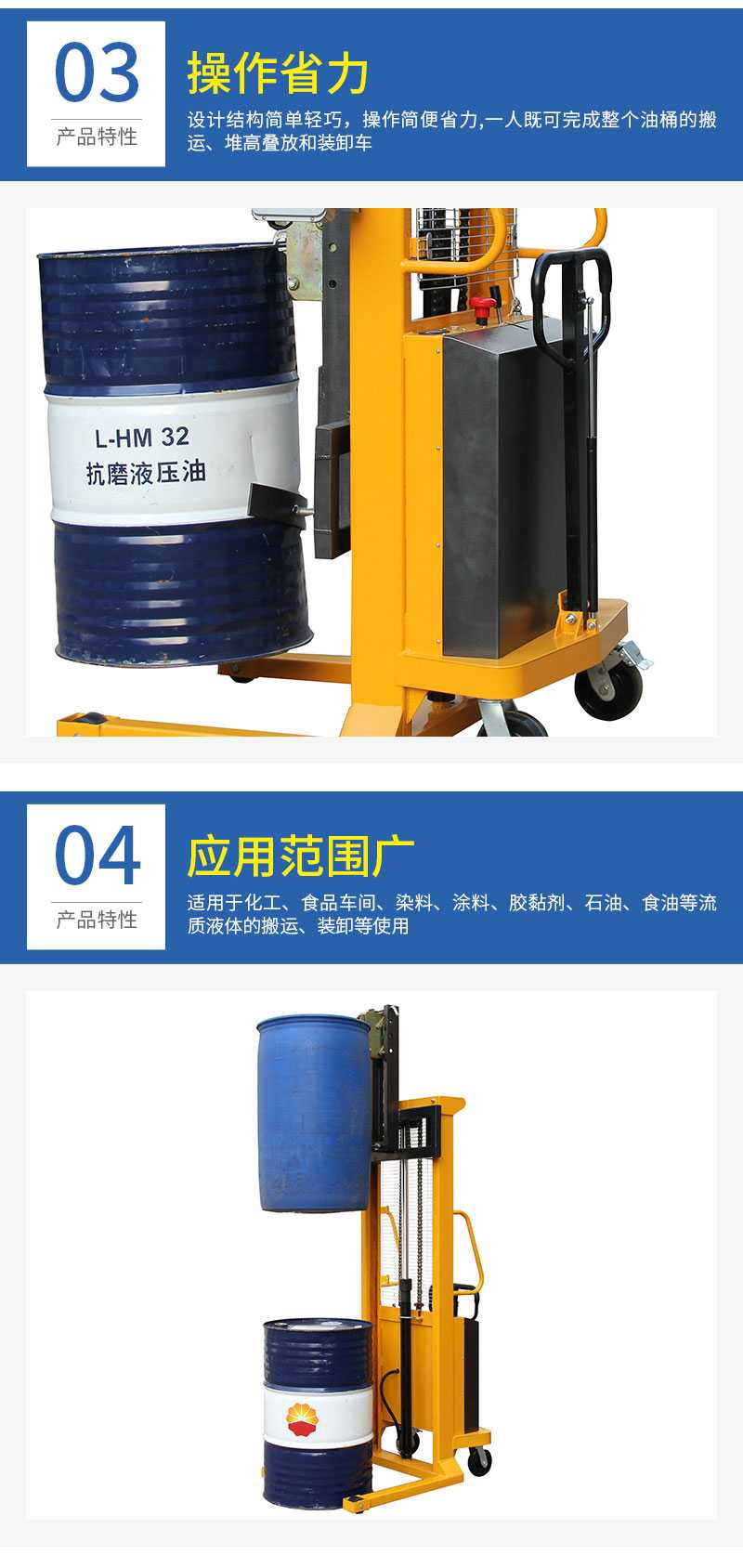 ★電動油桶搬運車設計結構簡單輕巧,操作簡便省力,一人既可完成整個油桶的搬運、堆高疊放和裝卸車。