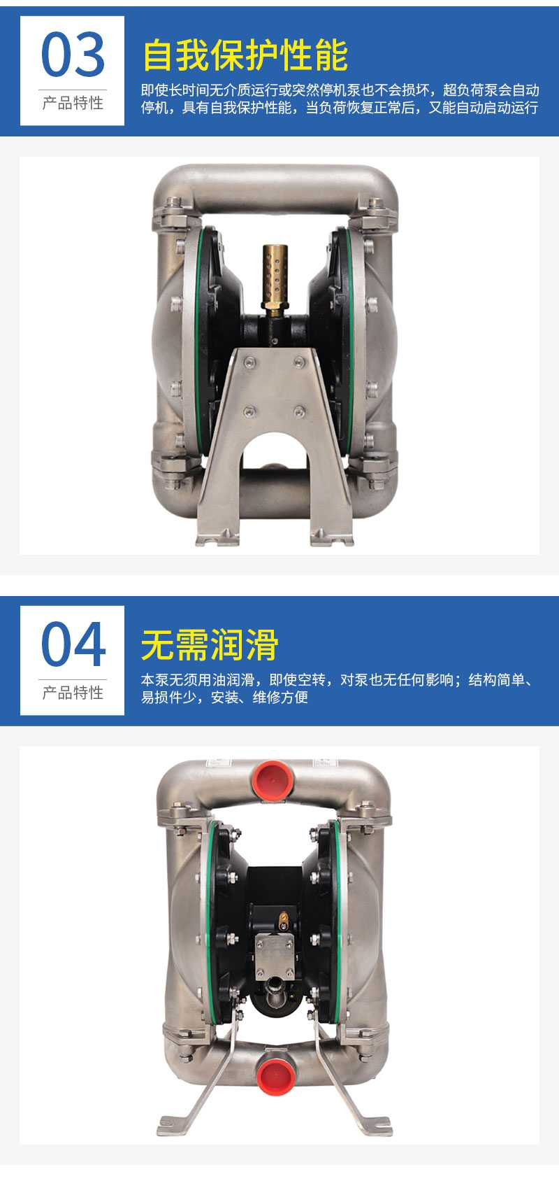 (1)泵不會過熱:壓縮空氣與電機為動力,在排氣時是一個膨脹吸熱的過程,氣動泵工作時溫度是降低的,無有害氣體排出。